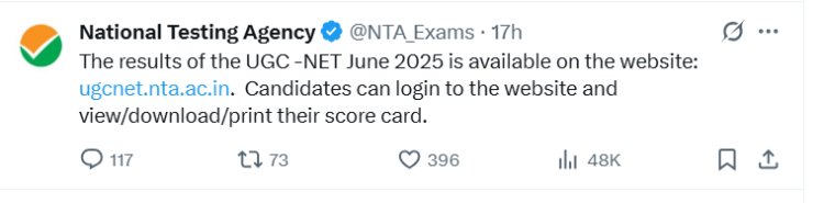 नॅशनल टेस्टिंग एजन्सीकडून (NTA) घेण्यात आलेल्या यूजीसी नेट (UGC NET Exam) जून २०२५ सत्र परीक्षेचा निकाल जाहीर (June 2025 session exam results announced) करण्यात आला आहे. या परीक्षेत सहभागी झालेल्या विद्यार्थ्यांना एनटीएचे अधिकृत संकेतस्थळ ugcnet.nta.ac.in वर जाऊन ऑनलाइन पद्धतीने निकाल पाहता येणार आहे. त्यामुळे जे विद्यार्थी जवळपास मागील एका महिन्यापासून निकालाची वाट पाहात होते, त्यांची आज अखेर प्रतीक्षा संपली आहे.