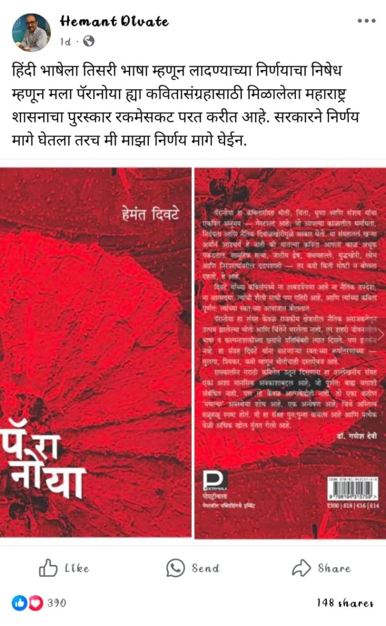 राज्यात भाषेवरून सध्या वादंग सुरु आहे. कारण नव्या शैक्षणिक धोरणामध्ये (New educational policies) पहिलीपासूनच्या वर्गातील मुलांना तिसरी भाषा (language) शिकणे बंधनकारक आल्याचे नमूद आहे. याशिवाय हिंदी भाषेशिवाय जर एखाद्याला अन्य भाषा शिकायची असेल तर २० विद्यार्थ्यांनी (students) तशी मागणी करणे गरजेचे आहे अशी अट शासनाने घातली आहे. त्यातूनच अप्रत्यक्षपणे पहिलीपासून मुलांना हिंदी भाषा सक्तीने शिकावी लागणार (Children will have to learn Hindi language compulsorily from the first grade.) आहे. राज्य शासनाने घेतलेल्या या भूमिकेचा सर्वच स्तरातून विरोध होत असताना आता लेखक, कवी हेमंत दिवटे (Writer, poet Hemant Divate) यांनीही हिंदी सक्तीच्या मुद्द्यावरून महाराष्ट्र शासनाने दिलेला पुरस्कार परत करणार (Will return the award given by the Maharashtra government) असल्याची घोषणा त्यांच्या सोशल मीडियावरून केली आहे.
