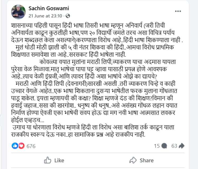 याबरोबरच हिंदी भाषा शिकण्याला नाही तर मुलं थोडी मोठी झाली की ५ वी नंतर हिंदी शिकवा. आमचा विरोध प्राथमिक शिक्षणात समावेशाला आहे. सरसकट हिंदी भाषेला नाही. कोवळ्या वयात मुलांना मराठी लिपी, व्याकरण याचा अदमास यायला पुरेसा वेळ मिळावा. मातृभाषेचा पाया घट्ट व्हावा यासाठी प्रयत्न होणे आवश्यक आहे त्याच वेळी इंग्रजी आणि त्यावर हिंदी अशा भाषांचे ओझे का द्यायचे? मराठी आणि हिंदी लिपी (देवनागरी)सारखी असली तरी व्याकरण चिन्हे व काही उच्चार वेगळे आहेत. एक भाषा शिकताना दुसऱ्या भाषेतील फरक मुलाना गोंधळात पाडू शकेल. इयत्ता म्हणायची की कक्षा? शिक्षा म्हणजे दंड की शिक्षण? विमान की हवाई जहाज. ससा की खरगोश. धनुष्य की धनुष. असे असंख्य गोंधळ लहान वयात निर्माण होण्याऐवजी एका भाषेची सवय होऊ द्या मग नवी भाषा आत्मसात लवकर होईल. उगाच या धोरणाला विरोध म्हणजे हिंदीला विरोध असा बालिश तर्क काढून याला राजकीय स्वरूप देऊ नका. हा सामाजिक प्रश्न आहे राजकीय नाही अशा शब्दात प्रसिद्ध लेखक सचिन गोस्वामी यांनीही सरकारला फटकारले आहे.